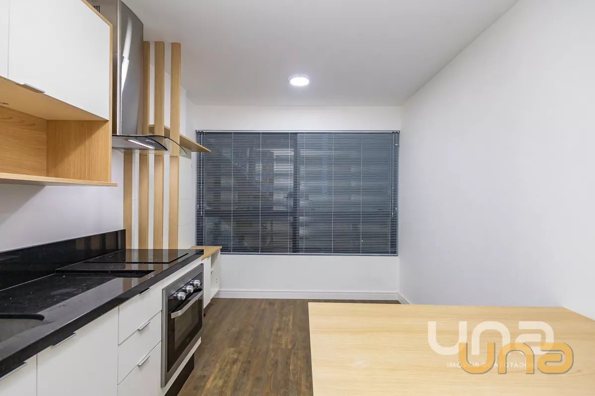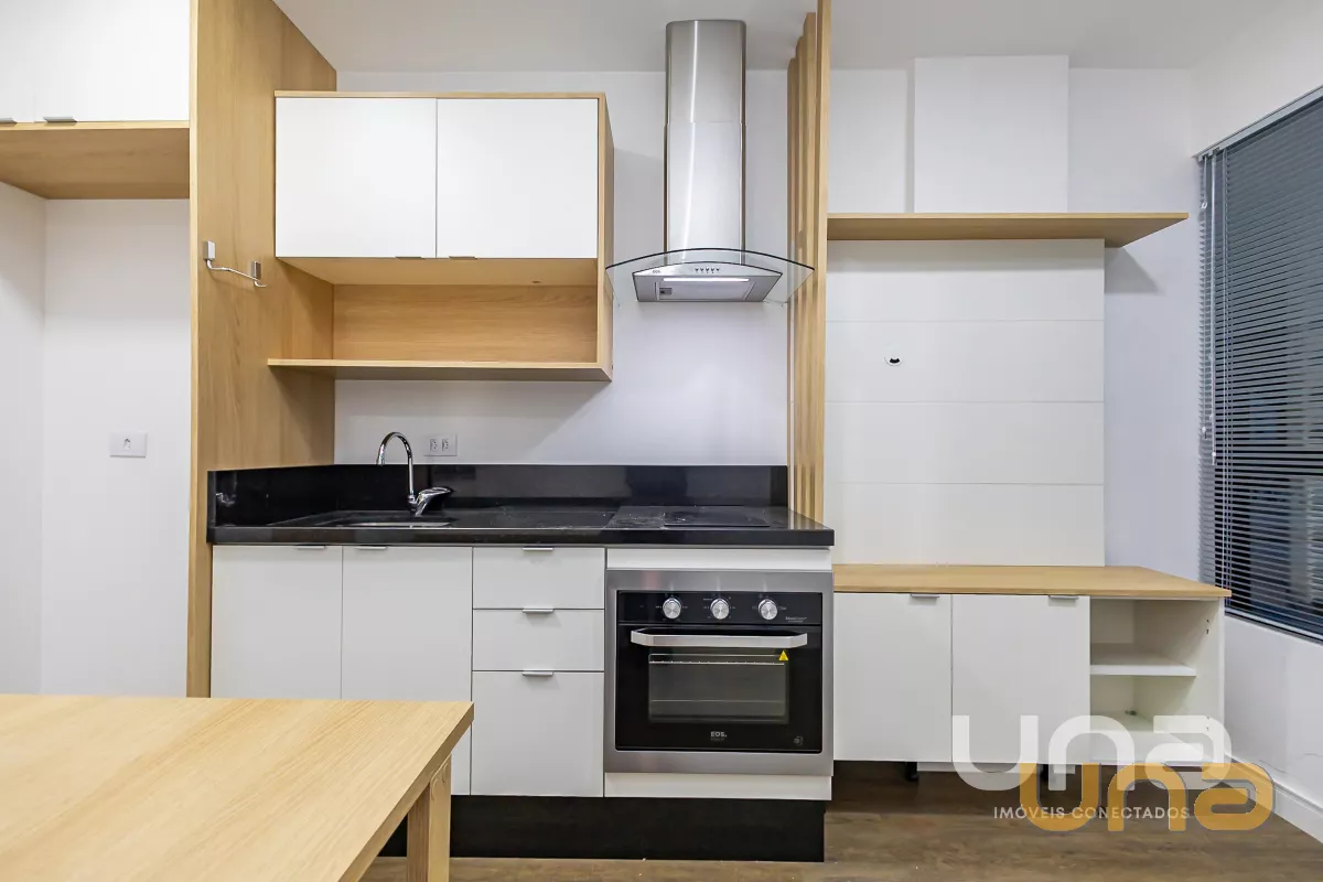 Cozinha com armários planejados, cooktop por indução, forno elétrico, coifa e mesa;