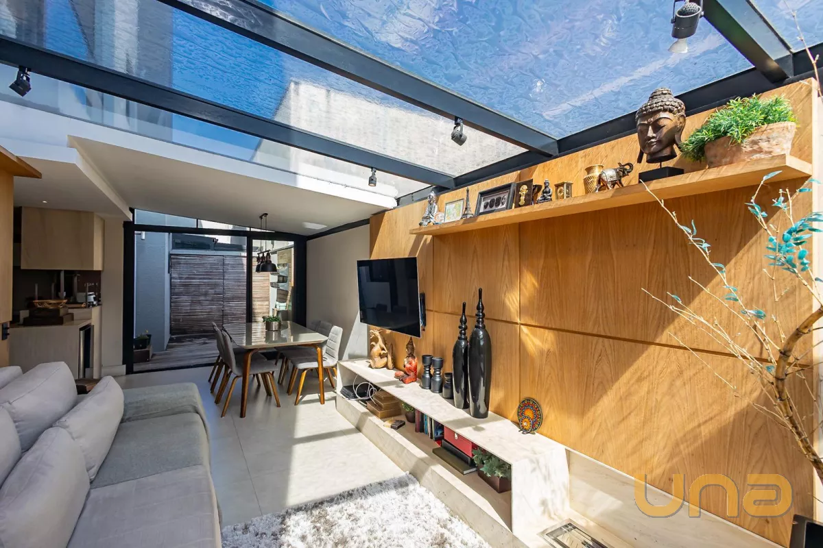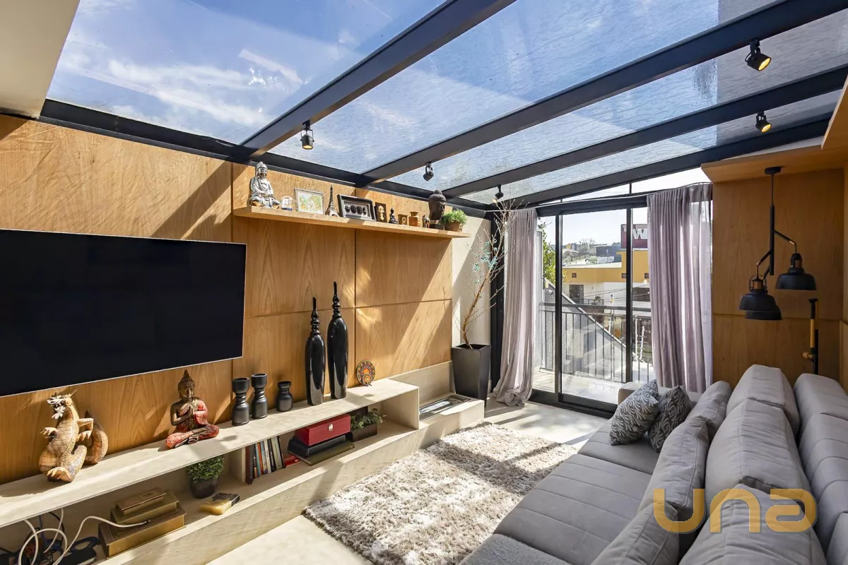 - Sala de estar com móveis em lâmina de madeira com teto retrátil