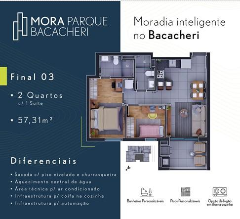 Detalhes: Excelente apartamento ao lado do Parque Bacacheri, cercado por natureza, tranquilidade e qualidade de vida. O imóvel contém sala com cozinha integrada, ampla sacada com churrasqueira a carvão e pia, banheiro social, suíte e mais um quarto, estrutura de automação preparada e compatível com Alexa e Google Home, forro de gesso em todo apartamento, pontos para ar-condicionado (sala e suíte), infraestrutura para coifa. Vaga de garagem livre demarcada n° 16.